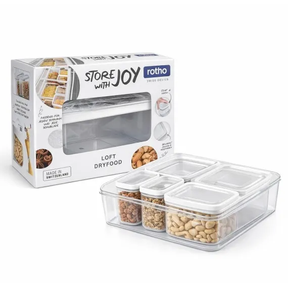 - : Setul include 5 recipiente de forme și înălțimi diferite, optimizate pentru diverse tipuri de alimente: