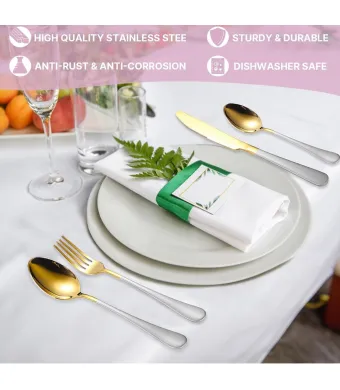 Acest set elegant de vesela din otel inoxidabil este fabricat din otel inoxidabil 1010 de calitate premium, asigurand durabilitate si rezistenta la rugina si coroziune. Setul versatil de 24 de piese include cutite de masa, furculite, linguri si o tava de servire, satisfacand toate nevoile dumneavoastra culinare. Culoarea sa aurie alb emana rafinament si completeaza orice aranjament de masa, fiind perfect pentru nunti, petreceri de casa noua sau ocazii speciale. Fiecare piesa este prezentata intr-o cutie cadou eleganta, adaugand o nota suplimentara de lux. Cu suprafata sa neteda, setul este usor de curatat si intretinut, asigurand igiena si longevitatea de-a lungul anilor de utilizare.
