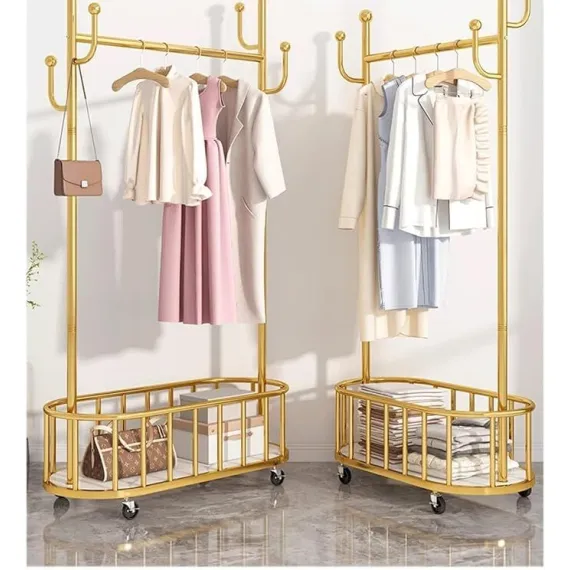 Acest cuier de podea multifuncțional reprezintă îmbinarea perfectă între estetica rafinată și utilitatea practică. Cu un finisaj auriu luxos și o structură inteligentă ce include atât zonă de agățare, cât și un coș generos pentru depozitare, acest produs este o piesă de mobilier esențială pentru holuri moderne, dormitoare sau dressing-uri tip boutique.